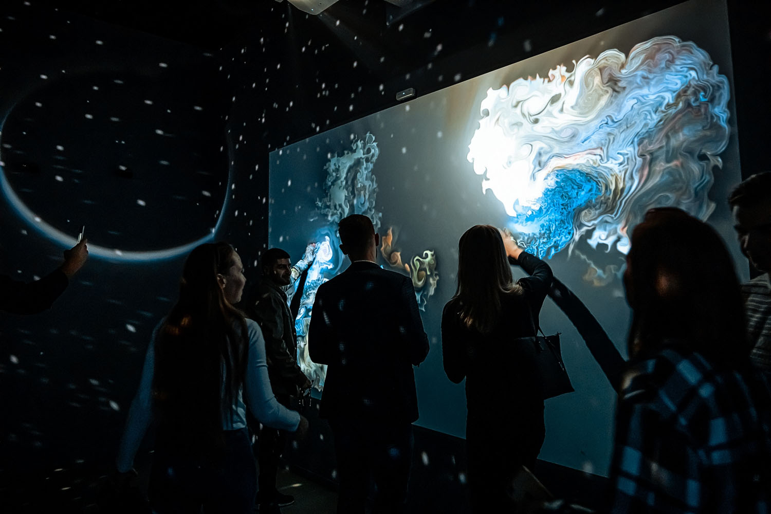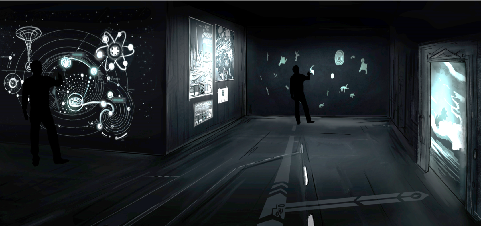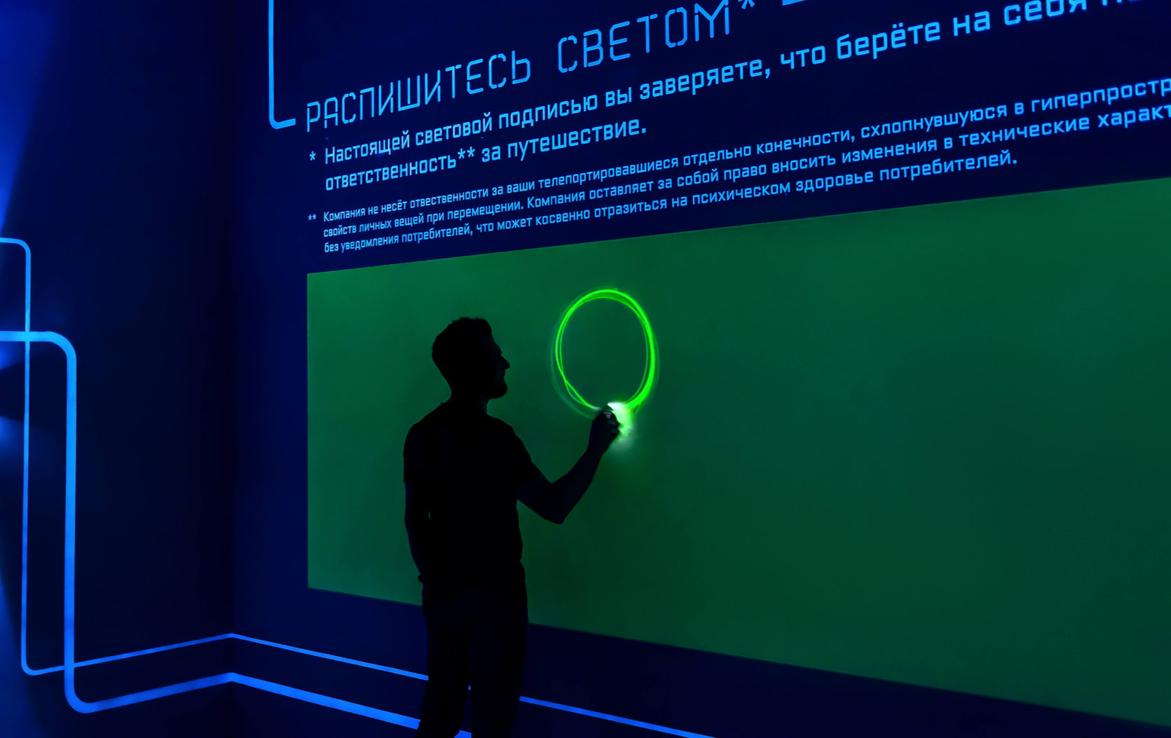 После нанесения трафаретной карты на стену, экспонат был дополнен сенсорной проекцией. Благодаря данному апгрейду, посетитель