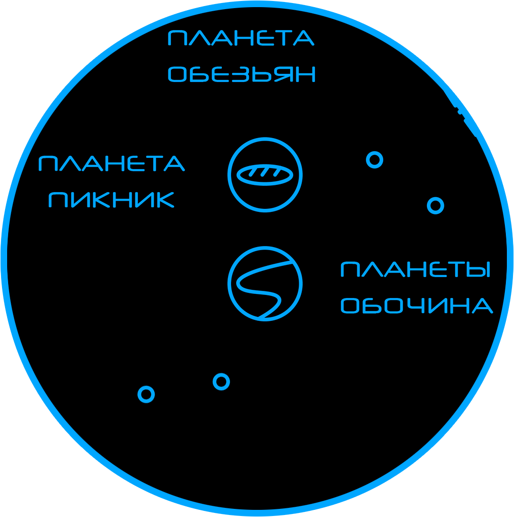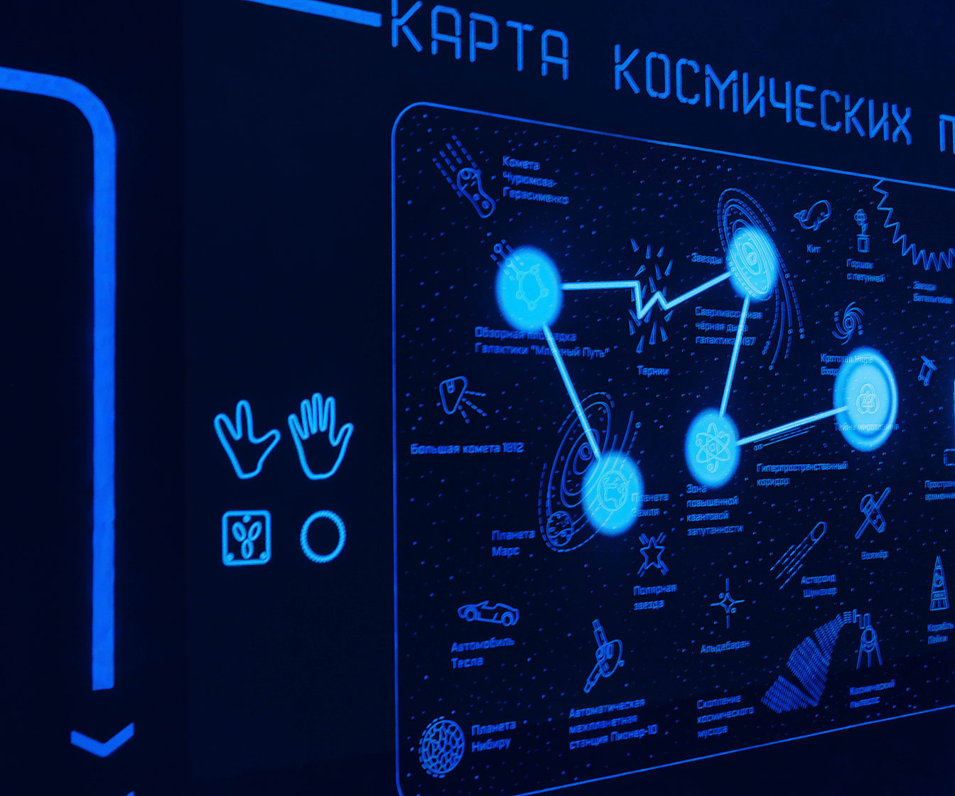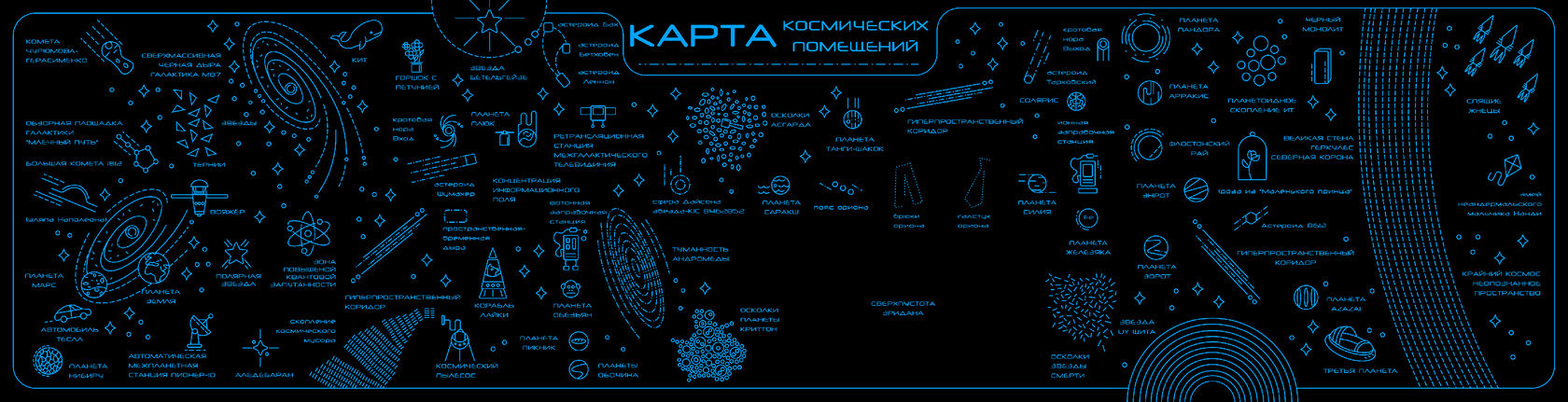 Жемчужиной «гиковской» мысли стала карта космических перемещений. На ней были размещены как и реальные игровые объекты, с которыми должен был столкнуться посетитель на выставке, так и дополнительные, шутливые или даже абсурдные.